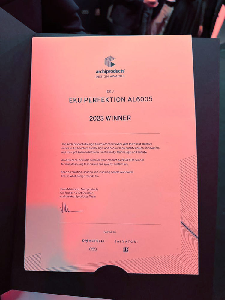 Eku ha recentemente ottenuto un prestigioso riconoscimento vincendo l’Archiproducts Design Awards 2023 nella categoria “Building shell” per il prodotto PERFEKTION MINIMAL AL6005. Questo premio è particolarmente significativo poiché gli Archiproducts Design Awards sono rinomati per connettere le menti creative più eccellenti nel campo dell’architettura e del design, premiando prodotti di alta qualità che si distinguono per innovazione, funzionalità, tecnologia e bellezza.