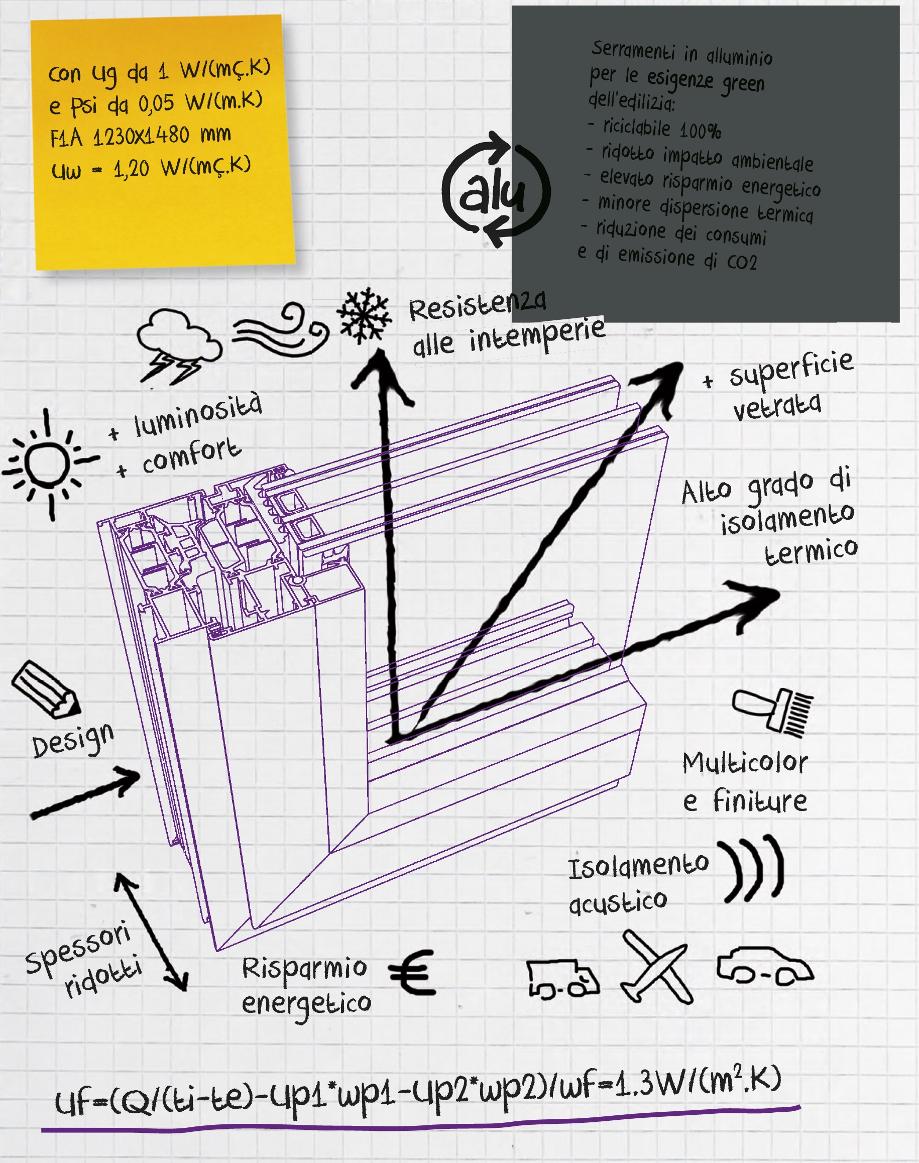 - Trasmittanza termica dei profili: Uf = 1,2/1,8 W/m2 K